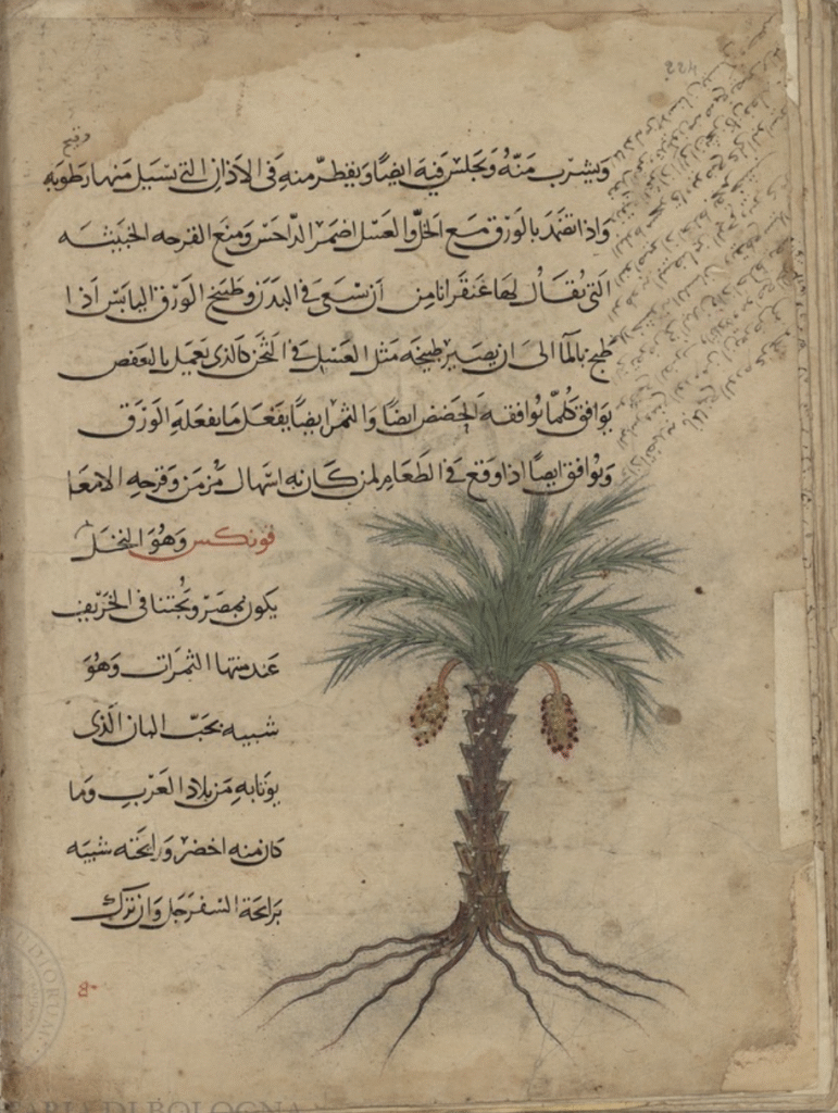 The fruit of the palm tree (Phoenix dactylifera L.), dates have played a crucial role in North Africa and the Near East; it was particularly abundant in Palestine and Phoenicia (the name actually comes from the Greek word for palm tree, foinix/φοίνιξ). Since time immemorial, dates were a staple food of desert dwellers, for whom it was a rich source of carbohydrates (due to the high sugar content) and protein, and was often eaten with milk. In addition, the pith (jummār) was – and still is – consumed, whereas the sap of the trunk, when fermented, became palm wine.