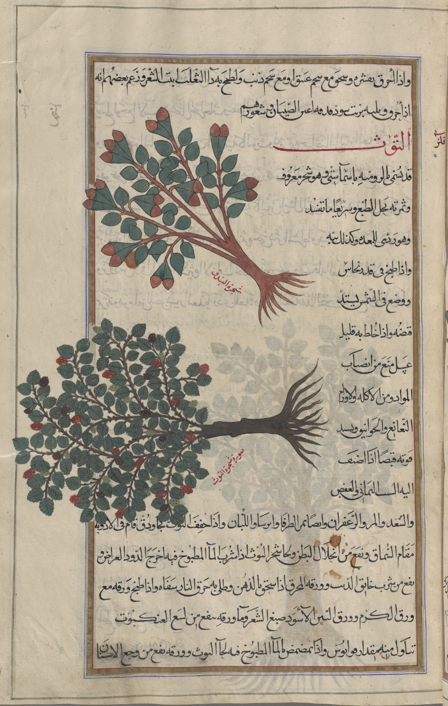 In Arabic, the mulberry was known as tūth (توث) or tūt (توت), the latter still being the term in modern Arabic. The word goes back to Assyrian tuttu (mulberry tree) but entered Arabic via the Aramaic tūtā. In Classical Arabic, it was also called firṣād (فرصاد), though this usually denoted the sweet mulberry. The blackberry (Rubus fruticosus) was known as tūth waḥshī (توت وحشي; ‘wild mulberry’) or ʿullayq (علّيق). In the literature, the white mulberry was often referred to as ‘sweet mulberry’ (توت حلو; tūt ḥulw), while the black variety was called ‘sour’ (حامض; ḥāmiḍ) or ‘Syrian (شامي; shāmī) mulberry.